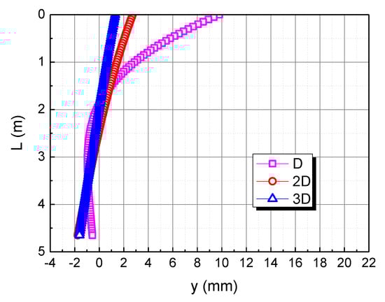 The pile diameter is taken as D, 2D, and 3D, respectively, to check the effect of the pile diameter on the horizontal deformation in the calcareous sand area, as shown in Figure 7. As the pile diameter increases, the horizontal displacement of the pile top decreases. The rigid rotation of the pile body is caused by the action of the horizontal load and the bending moment. When the pile diameter is 2D and 3D, the horizontal displacement curve of the pile body is almost straight because of the increase in the pile body’s bending stiffness, resulting from the increase of the pile diameter. When the pile diameter is small, the stiffness of the pile body is small, and the pile body is more prone to deflection and deformation under the action of the pile top load. With the continuous increase of the pile diameter, the stiffness of the pile body increases, and the pile body is not prone to deflection, so the deformation is closer to a straight line.