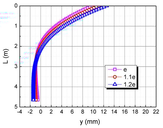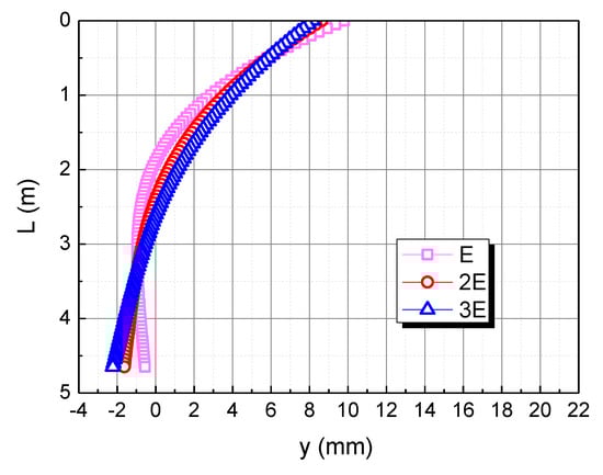 The elastic modulus of the pile body is taken as E, 2E, and 3E, respectively, to understand the effect of the pile elastic modulus on the horizontal deformation in the calcareous sand area, as shown in Figure 8. As the elastic modulus of the pile body increases, the horizontal displacement of the pile top decreases. When the elastic modulus of the pile body is 2E and 3E, the horizontal displacement curve of the pile body tends to be a straight line. This is because the bending stiffness of the pile body increases with the increase of the elastic modulus of the pile body, and the pile body rotates rigidly due to the action of the horizontal load and the bending moment.