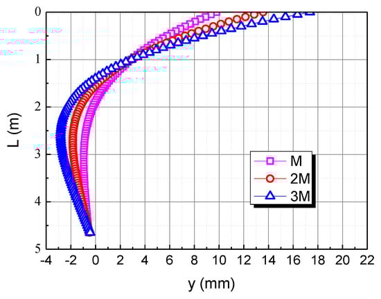 To reveal the effect of the bending moment, the bending moment is taken as M, 2M, and 3M, respectively. The influence of the bending moment on the horizontal displacement of the pile body in the calcareous sand area is shown in Figure 10. As the bending moment increases, the horizontal displacement of the pile top increases. When the bending moment is 2M and 3M, the horizontal displacement of the pile top is 13.6 mm and 17.4 mm, respectively. The horizontal displacement of the three piles is 0 at the depth of 1.9 m, 1.5 m and 1.4 m respectively, which indicates that the greater the bending moment, the shallower the 0 point of the pile displacement. This is mainly due to the fact that the greater the bending moment, the greater the deflection of the pile, which makes the 0 point of the pile displacement shallower.