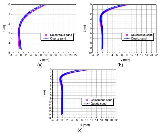 The pile length is taken as L, 2L, and 3L, respectively. The influence of the pile length on the horizontal displacement of the pile body is shown in Figure 12. When the pile length is L, the horizontal displacement of the pile top in the calcareous sand area is 0.63122 mm larger than in the quartz sand area. When the pile length is 2L, the horizontal displacement of the pile top in the calcareous sand area is 0.60970 mm larger than in the quartz sand area. When the pile length is 3L, the horizontal displacement of the pile top in the calcareous sand area is 0.60969 mm larger than in the quartz sand area. The smaller the pile length, the greater the difference between the two. It may be because the smaller the pile length, the greater the stiffness of the pile body, which makes calcareous sand easier to compress than quartz sand.