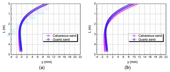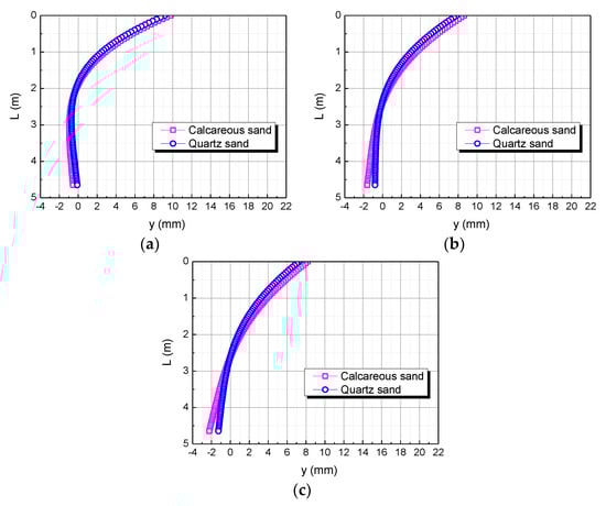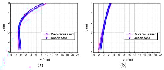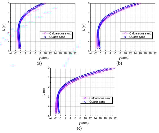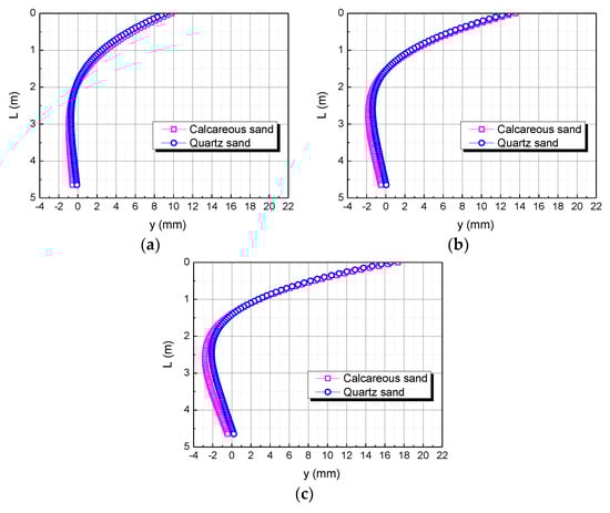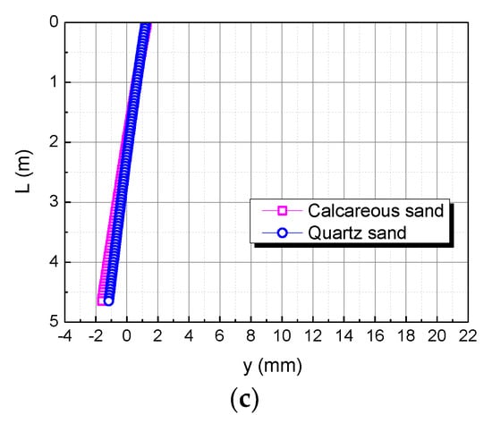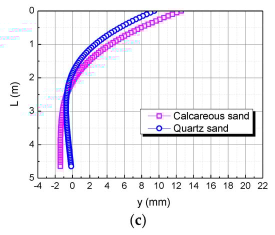 The studies of Coop et al. (2004) and Shen Yang et al. (2019) showed that calcareous sand can be mechanically broken under a lower external load than quartz sand, including breaking, crushing, and grinding of particles; this phenomenon can reasonably explain the compressive modulus of calcareous sand being less than that of quartz sand, which makes the horizontal displacement of the pile top in the calcareous sand area greater than that in the quartz sand area under the same conditions [34,35].