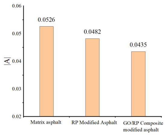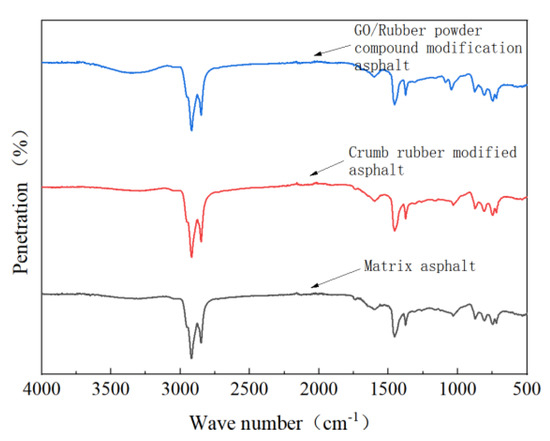 - From the microscopic morphology of the two modified asphalts, it can be seen that the RP-modified asphalt with GO becomes smooth and compliant, which improves the segregation state of RP in the matrix asphalt and increases the storage stability of the rubber powder-modified asphalt. It can be seen from the infrared spectrum that the absorbance curve of GO/RP composite-modified asphalt is roughly the same as that of matrix asphalt and RP-modified asphalt. The GO/RP composite-modified asphalt has a broadened absorption peak band in the range of 3100–3700 cm−1, which is due to the weak oxidation reaction between the CH functional group in the matrix asphalt and GO during preparation. In general, GO and RP mainly exist in the form of physical compatibility in base asphalt. This is of great significance to the performance and mechanism of GO/RP composite-modified asphalt, and lays a theoretical foundation for future wide application.