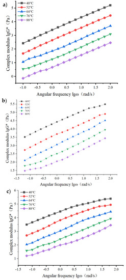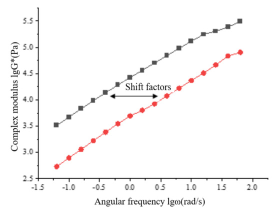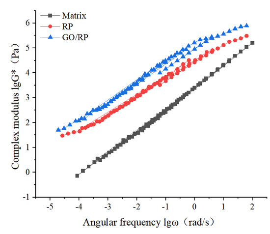 - Through the frequency scanning test results, the complex modulus–angle frequency curve is drawn. When the temperature is between 40 °C and 88 °C, the G* values of the three asphalts are negatively correlated with the temperature. Using the time–temperature equivalence principle to construct the main curve, it can be found that the G* of the three asphalts increases with the increase in the angular frequency, and the G* relationship of the complex modulus is GO/RP composite-modified asphalt > RP-modified asphalt > matrix asphalt, indicating that the high-temperature rheological properties of GO/RP composite-modified asphalt are superior and have better deformation resistance at high temperature.