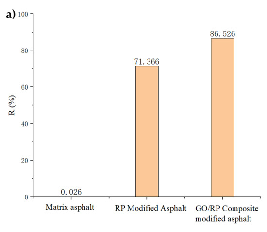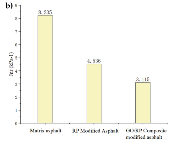 - According to the MSCR test data, under the condition of 64 °C, the cumulative strain of the GO/RP composite-modified asphalt at the two stress levels is the smallest. Calculating its R and Jnr at the 0.1 kPa stress level found that the addition of GO increased the R value of RP-modified asphalt by 21.2%, while the Jnr decreased by 31.3%. Both indicate that the GO/RP composite-modified asphalt has better creep recovery ability.
