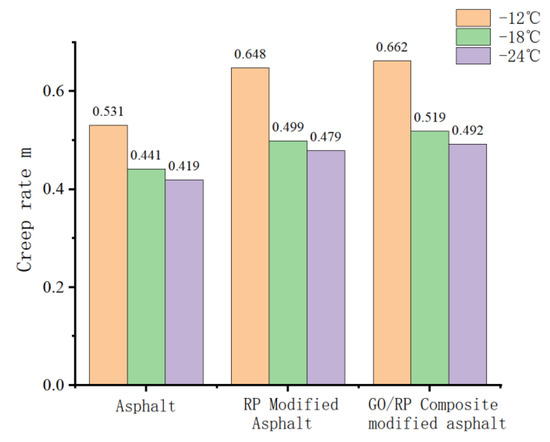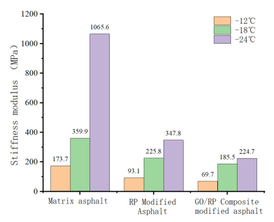 - BBR test shows that the S value of GO/RP composite-modified asphalt is the minimum at the same temperature of different asphalt, and the base asphalt decreases by 78.9% at −24 °C, and 35.4% compared with RP-modified asphalt. Moreover, the M value of GO/RP composite-modified asphalt is the maximum at the same temperature, indicating that the internal stress of asphalt is the minimum. Burgers model analysis shows that at −12 °C, GO/RP composite-modified asphalt decreases by 17.5% compared with base asphalt, and 6% compared with RP-modified asphalt, indicating that GO and RP as composite modifiers have a better low-temperature improvement effect on base asphalt.