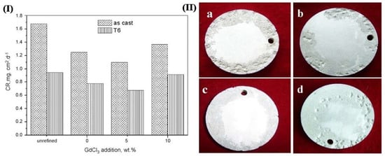 (I) corrosion rates of GW103K alloy; (II) Surface corrosion morphologies after immersed in 5 wt.% NaCl for 3 days ((a) unrefined, (b) refined by JDMJ, (c) refined by JDMJ + 5 wt.% GdCl3 additions, (d) refined by JDMJ + 10 wt.% GdCl3 additions) [35].
