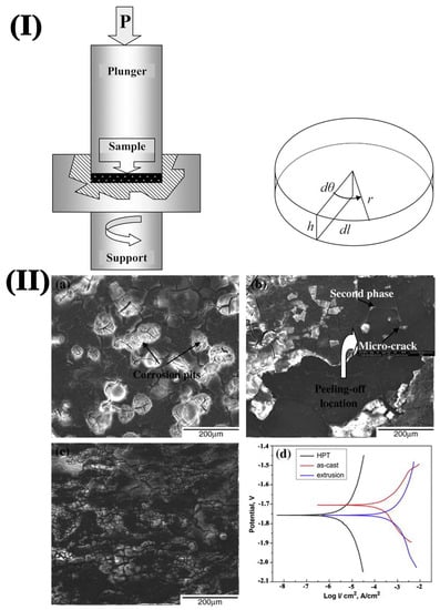 (I) Schematic illustration of HPT processing; [67] (II) SEM images of (a) as-cast, (b) convention extrusion and (c) HPT-treated samples after immersion for 2 days; (d) potentiodynamic curves [68].