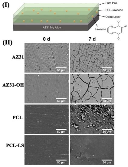 - Asadi, H.; Suganthan, B.; Ghalei, S.; Handa, H.; Ramasamy, R.P. A multifunctional polymeric coating incorporating lawsone with corrosion resistance and antibacterial activity for biomedical Mg alloys. Prog. Org. Coat. 2021, 153, 106157. [Google Scholar] [CrossRef]
