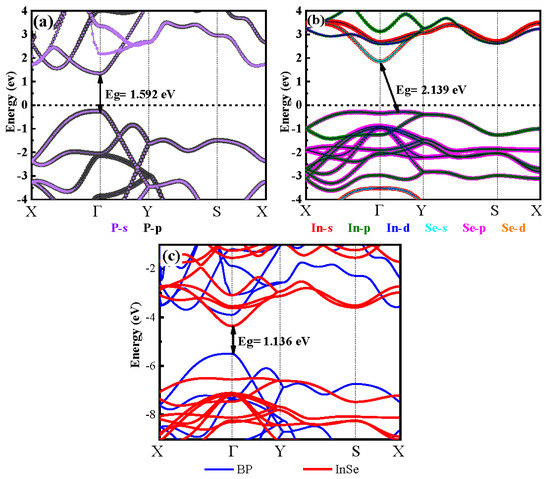 The HSE06-based projected band structure properties of the BP, InSe monolayer and BP/InSe heterojunction are shown in Figure 2. For the BP monolayer (Figure 2a), the bandgap value is 1.592 eV (agreement with the reported value (1.506 eV) [28], and the valence band maximum (VBM) and conduction band minimum (CBM) are both located the Γ point. In detail, the P-p orbit dominates the CBM and VBM. For the InSe monolayer (Figure 2b), it displays an indirect band gap (2.139 eV) semiconductor and the bandgap value is ’consistent with the reported value (2.121 eV) [29]. The VBM is located between the Γ and Y points and the CBM at the Γ point, and the energy difference is 57 meV between the direct and indirect band gaps. In addition, the valence band is mainly contributed by the Se-p and In-p states, while the conduction band is dominated by In-s states. Moreover, for the BP/InSe heterojunction, the detailed electronic properties can be obtained from Figure 2c. The obtained BP/InSe heterostructure is a direct semiconductor with a band gap of 1.136 eV, and the VBM and CBM are located at the Γ point. The CBM is mainly contributed by the InSe monolayer, and the VBM is mainly contributed by the BP monolayer. The VBM value of BP is greater than the VBM value of InSe and less than the CBM value of InSe, and the CBM value of BP is greater than the CBM value of InSe. The BP/InSe heterostructure is a type II heterojunction. The band offset of BP and InSe is 1 eV for the VBM, while it is only 0.4 eV for the CBM, reducing the recombination probability of electrons and holes, which is beneficial for carrier mobility of photoelectric devices. The meaningful discussion is the isosurface plots of the band decomposed charge densities for the CBM and the VBM (Figure 3). The VBM is mainly provided by the states from the BP monolayer, and the CBM is dominated by the states from the InSe monolayer. The holes and electrons are mainly localized in the InSe and BP regions, respectively. Spatial localization of the holes in CBM and the electrons in VBM is advantageous for the separation of electron–hole pairs in BP/InSe heterojunction, which is beneficial to improving the performance of photoelectric devices [30,31].