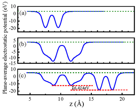 Furthermore, the plane-average electrostatic potential profile of the BP monolayer, InSe monolayer, and BP/InSe heterojunction along the z-direction are shown in Figure 4, respectively. Due to the structural symmetry of the BP monolayer (Figure 1a) and InSe monolayer (Figure 1b), the plane-average electrostatic potential profile of the BP monolayer (Figure 4a) and InSe monolayer (Figure 4b) also exhibits obvious symmetry. For the plane-average electrostatic potential profile of BP/InSe heterojunction (Figure 4c), there is a large potential drop (6.424 eV) between BP/InSe heterojunction interfaces, which implies that electrons are transferred from the BP monolayer to the InSe monolayer and an internal electric field is formed near the interface. Meanwhile, the large potential drops will achieve a low recombination rate for photoinduced electron–hole pairs [32], which is beneficial to improve the performance of photoelectric devices.