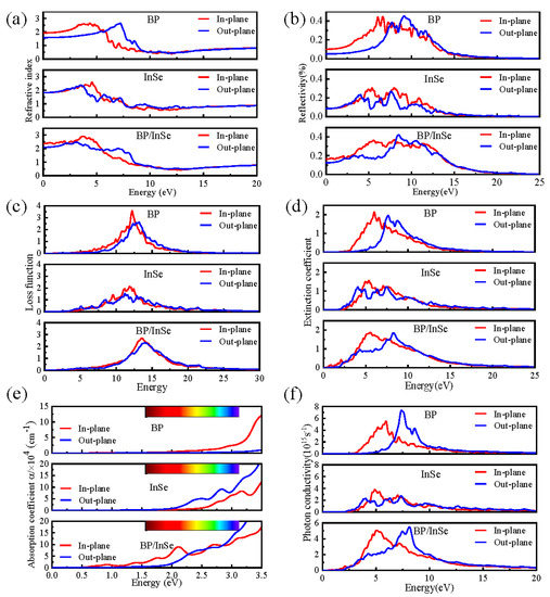 Graphs displaying the dependence of refractive index on energy for BP, InSe monolayer and BP/InSe heterojunction are shown in Figure 5a. For all studied materials, the in-plane exhibits a higher refractive index than the out-plane in the low energy region (<6 eV), and the opposite is true in the high energy region (>6 eV). The maximum of the in-plane refractive index is located at 5 eV, and the out-plane n is located at 7.5 eV. Meanwhile, the in-plane refractive index of BP monolayer and out-plane refractive index of InSe monolayer are similar to the in-plane and out-plane refractive index profile curves of BP/InSe heterojunction, respectively. This means that the in-plane refractive index of the BP monolayer has a significant influence on the in-plane refractive index of BP/InSe heterojunction, while the out-plane refractive index of the InSe monolayer has an obvious influence on the out-plane refractive index of BP/InSe heterojunction; this phenomenon may be attributed to the heterojunction structure affecting the volume of the system [35].