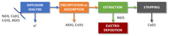 To selectively separate Ni(II) from waste solutions containing other ions, such as Cr(III), Al(III), Co(II), Fe(II), Fe(III) and/or (III), chlorides, sulfates, etc., a hydrometallurgical process was proposed (Figure 1). It included operations such as diffusion dialysis (DD), Cr(III) removal by precipitation (P) or adsorption (A), extraction of Co(II) into the organic phase (E), Co(II) stripping from the loaded organic phase (S) and the organic phase regeneration and reuse. Ni(II)-containing raffinate after extraction was required for the final stage of the nickel recovery, i.e., for nickel electrodeposition on the cathodes.