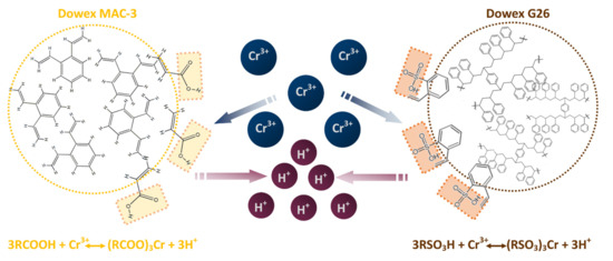 Therefore, acidic resins were chosen for the adsorption of Cr(III) from acidic leach solutions, and the graphical representation of the Cr(III) adsorption mechanism with Dowex G26 and MAC-3 is shown in Figure 2.