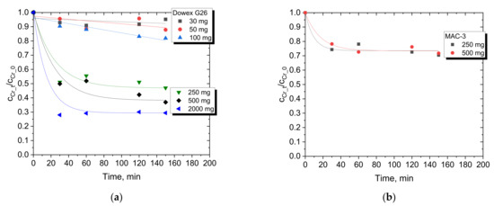 As expected, with increasing amounts of Dowex G26 resin (decreasing L/S ratio from 1/15 to 1/1000 cm3/mg), the concentration of Cr(III) in the feed is reduced even by two-thirds for 2000 mg of the resin used. However, there is no large difference in decreasing Cr(III) concentration in the feed between the use of 500 and 2000 mg of Dowex G26, and therefore, 500 mg was chosen for most adsorption experiments. Based on the preliminary results for Dowex G26 (Figure 3a), only two amounts of resin were investigated for MAC-3, i.e., 250 and 500 mg (Figure 3b). It is visible in both Figure 3 and Figure 4 that Cr(III) adsorption is more efficient with Dowex G26 than with MAC-3. Especially when the initial concentration of Cr(III) is low, Dowex G26 (L/S = 1/250 cm3/mg) retains 80% of the metal ions, while MAC-3 adsorbs more than 50%. When 40 g/dm3 Cr(III) was present in the feed, Dowex G26 and MAC-3 were able to remove comparable amounts from the aqueous solution, close to 50%. It should also be noted that 150 min is enough to achieve equilibrium (the Cr(III) concentration does not change) for adsorption with both resins in the amount range of 250–2000 mg.