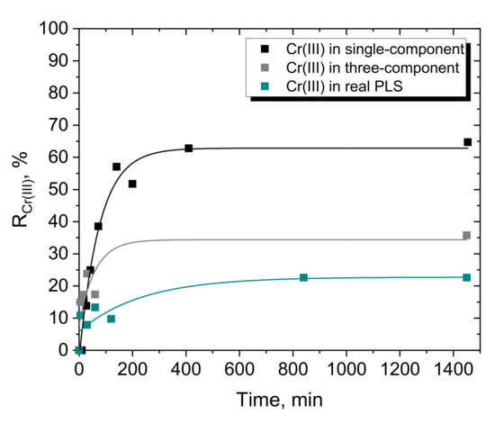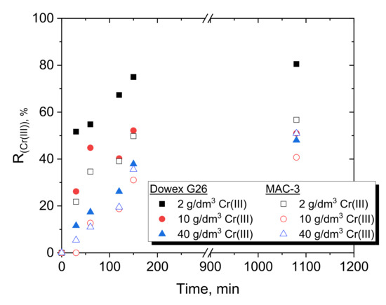 Typically, for cationic exchange resins, the capture of metals increases with increasing pH. It is worth mentioning that even at high H+, i.e., low pH, the adsorption efficiency of Cr(III) with Dowex G26 exceeds 60% after 2.5 h of contact. Following the observations of Alguacil for the acidic resin Amberlite 200 [24], it can be assumed that Dowex G26 also has the potential to be applied to remove Cr(III) even from solutions of high acidity. Unlike Dowex G26, weak acidic MAC-3 does not show good Cr(III) removal properties after 150 min of contact (maximum 45% Cr(III) removal). After 1080 min of phase contact, the adsorption efficiency with MAC-3 increases to even 65% at pH 4.4 and L/S = 1/250 cm3/mg (500 mg of resin). This again confirms that this resin is not suitable for the tested system.