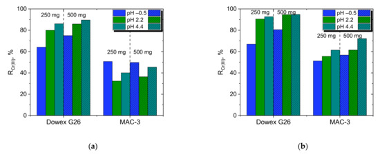 Because from a practical point of view, the influence of pH on adsorption efficiency is important, the effect of pH on the adsorption of Cr(III) by Dowex G26 and MAC-3 was studied using a model solution containing 2 g/dm3 Cr(III) at pH −0.5 (3 M H+), 2.3, 4.4, and the results are shown in Figure 5.