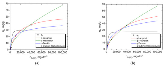 The equilibrium and kinetic studies of Cr(III) adsorption from one-component model solutions allowed the performance and efficiency of the operation to be determined. According to the theoretical assumptions, the efficiency of the adsorbent was determined from equilibrium studies based on the Langmuir, Freundlich, Temkin and Dubinin–Radushkevich isotherms [32]. The calculated parameters are summarized in Table 3, while the comparison of all isotherms with the experimental data is presented in Figure 6. On the other hand, the kinetic studies allowed the estimation of the removal rate of chromium ions from the system by applying the pseudo-first-order and second-order equations (PFO, PSO) (Table 4 and Table 5).