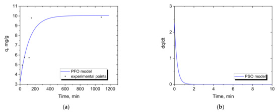 Pseudo-first- and second-order equations are used to describe adsorption kinetics (PFO and PSO, respectively) according to the equations: