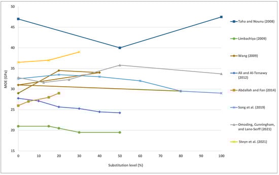 Bulk density of concrete with various content of WG. Adapted from references [56,65,80,83,84,87,105,106,107].