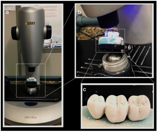(a) Prosthesis on Sirona InEos Blue scanner base; (b) scanning; (c) silicone-based prosthesis with the application of Cerec Optispray (Cerec Optispray, Sirona, Bensheim, Germany).