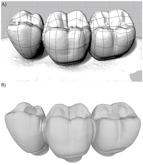 (A) Lines and meshes over the.STL file; (B) 3D model of the 3-unit fixed partial denture.