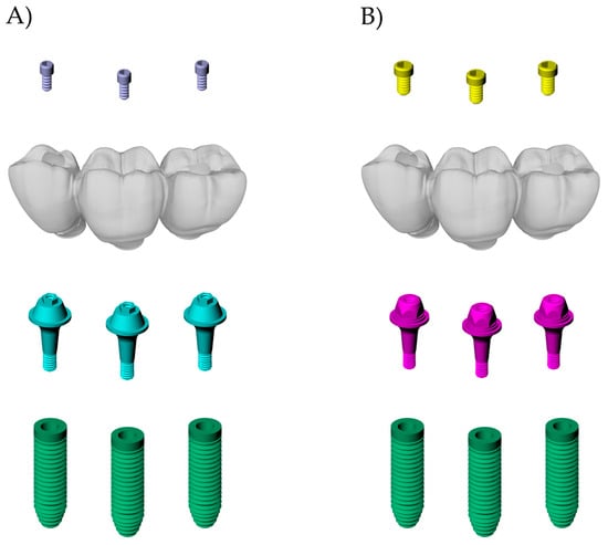 Then, the 3-unit fixed partial dentures were positioned on their respective abutments, ensuring no misfit between them. Each abutment received its respective prosthetic screw (CMN: 1.8 mm and MC: 1.2 mm). Finally, all three-dimensional models from the CMN (Figure 3a) and MC groups (Figure 3b) were checked as volumetric solids and their geometries were saved as STEP files.