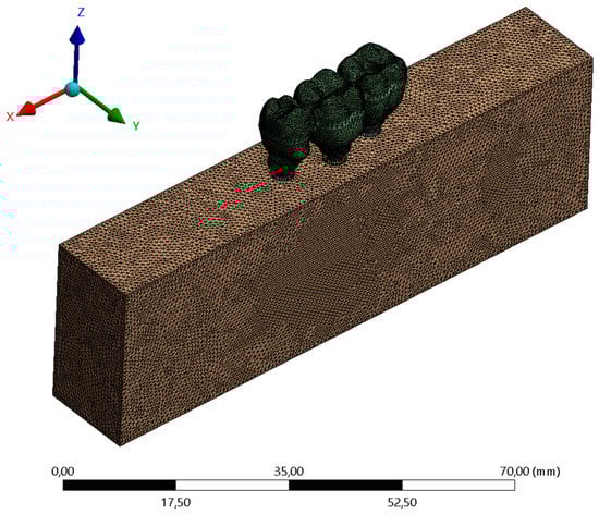 The meshes were created automatically by selecting the 0.3 mm parameter of tetrahedral elements. Then, a 10% convergence test [6,12,13] determined 390.548 elements and 702.122 nodes for the CMN group and 411.192 elements and 690.548 nodes for the MC group. For each axial load: point A (center of implant retention screw #13); point B (center of implant retention screw #14), and point C (center of implant retention #15) an analysis configuration was inserted, and the load was defined as vectorial in the Z axis with 300 N (30.6 Kgf). The fixation was defined on the bottom surface of the polyurethane block (Figure 4).