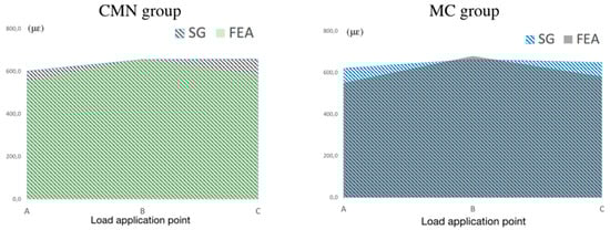 For the validation of the theoretical models (FEA), the microstrain values were calculated in the same positions and directions as the experimental models (SG). Peri-implant microstrain was adopted as an analysis criterion for the correlation between methodologies, allowing its validation. To each loading application point (A, B, and C), the values of the four SG positions were measured, and the means were calculated, plotted on graphs, and overlapped to show the compatibility in the results of the theoretical and experimental models from CMN and MC groups. To the CMN group, the microstrain means for the used methodologies (FEA: 605.1 με; SGs: 645.3 με) presented a difference of 6.33%, and to the MC groups (FEA: 598.8 με; SGs: 639.3 με) the difference was 6.4% (Figure 6).
