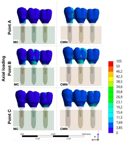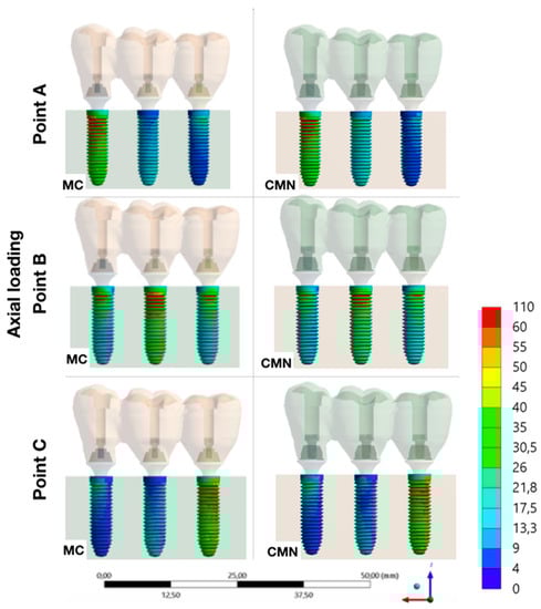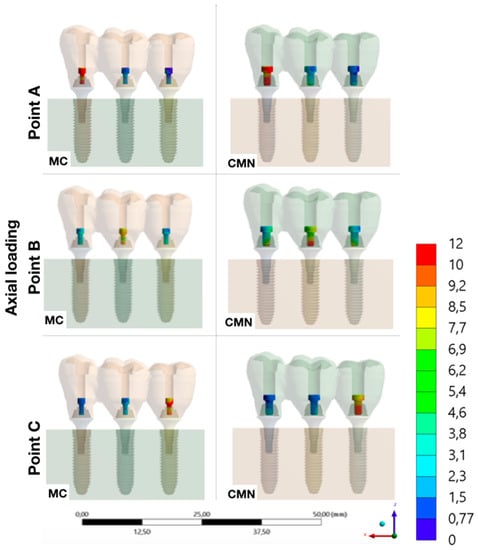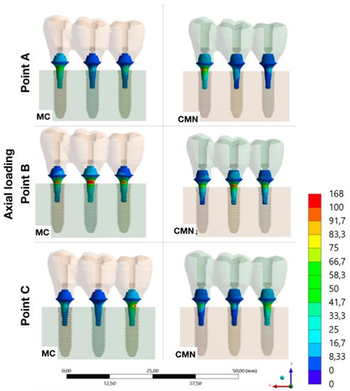 Maximum principal stress (MPa) at the implants for the load application at points A, B, and C (CMN and MC groups).