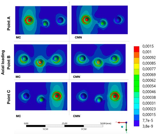 Regarding the FEA, quantitative and qualitative results were obtained, since this analysis showed that CMN and MC groups showed much approximation in their strain peaks, 1189 με and 1192 με, respectively. Corroborating with the results obtained in the experimental models (SG), the strain values observed in the theoretical models (FEA) were also presented within the physiological limits. According to the Mann–Whitney test, it was not possible to observe a statistical difference (W = 0.88; p = 0.932) between CMN (605.1 ± 358.6 με) and MC (598.7 ± 357.9 με) groups. Regarding the “load application point” factor, the following microstrains (με) means were observed for points A, B, and C: 553.2 ± 421.5; 670.3 ± 56.8, and 582.2 ± 462.5 με, respectively. The Kruskal–Wallis followed by Dunn’s multiple comparison test (α = 5%) demonstrated there was no statistical difference for this factor (df = 2; x2 = 0.08; p = 0.960).