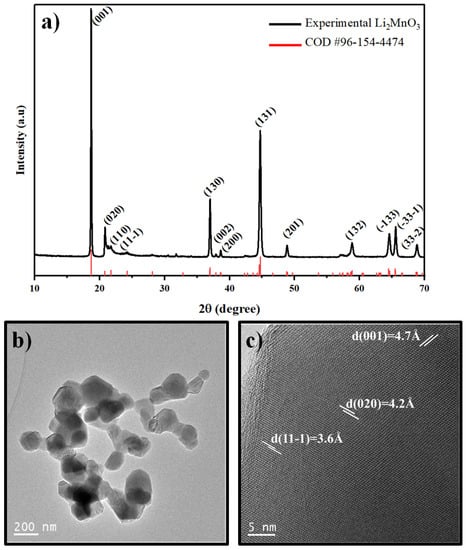 HRTEM was used for the local study of the microstructure of LMO. HRTEM images (Figure 2b) show the presence of agglomerated nanoparticles with granular morphology and particle sizes between 100 and 200 nm. Moreover, by analyzing the HRTEM image in Figure 2c, it is possible to identify the [001], [020] and [11-1] zone axes with interplanar spacings of 4.7 Å, 4.2 Å and 3.6 Å, respectively, which correspond to the layered structure Li2MnO3 [,].