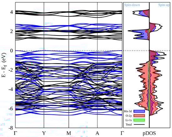 Figure 3 shows the predicted projected density of states (pDOS) and band structure of the Li2MnO3 along with the high-symmetry points of the first Brillouin zone. The Fermi energy level () has been set to zero energy. The electronic DOS of the Figure 3 shows an overlap/hybridization between the state of Mn and the state of O, which is characteristic of transition metal oxides []. The occupied states at the Fermi level are largely constituted of O , while the Mn orbitals contribute more to the conduction bands. The band gap between the lowest conduction and maximum valence levels are 1.65 eV and 1.99 eV for the spin-up and down configuration, respectively, thus assuming a semiconductor behavior. On the other hand, the electronic band structure of Li2MnO3 indicates that both valence band maximum and conduction band minimum are localized at the -point.