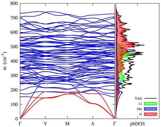 The computed phonon bands dispersion and phonon DOS for Li2MnO3 along the high-symmetry directions of the first Brillouin zone are shown in Figure 4. Importantly, the absence of imaginary frequency modes in the Brillouin zone demonstrates the structural dynamical stability of our model of Li2MnO3 [,]. According to the dispersion curves in Figure 4, the highest wavenumber is about 700 cm−1. More interestingly, the phonon band structure of Li2MnO3 does not contain a phonon gap []. The phonon DOS for Li2MnO3 is shown on the right-hand of Figure 4. The shaded green, red, and blue areas represent Li, O, and Mn atom phonon partial DOS, respectively. On the one hand, it is evident that the O atom contributes to the overall phonon distribution, dominating the zone with the highest intensities at higher frequencies. Additionally, the phonon distribution of the Mn atom extends to the whole spectrum but with lower intensity than the O atom. Interestingly, there is a hybridization between Mn and O vibrational states at higher frequencies. On the other hand, the phonon distribution of the Li atom mainly contributes to the middle part of the spectrum, ranging from 200 cm−1 to 500 cm−1, suggesting hybridization between Li and O vibrational states in this zone.