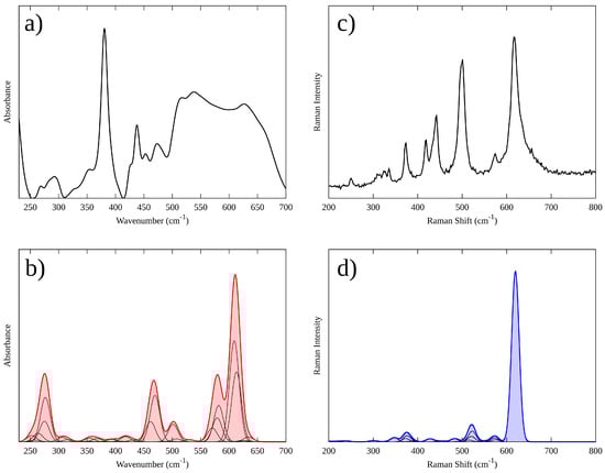 The experimental and theoretical IR and Raman spectra are shown in Figure 5. The IR and Raman spectra calculated for Li2MnO3 were based on lattice dynamic simulations. As has been previously shown for other transition metal oxides, in our case, the number of experimental modes is much lower than that expected theoretically due to the three possible circumstances: (i) certain modes have very similar energy; (ii) stronger bands may overlap some weaker bands, and (iii) in spectra of a randomly oriented crystalline material, the relevant bands cannot be resolved properly [,].