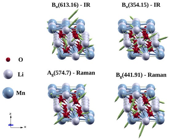Figure 5c shows the typical Raman spectra of the synthesized Li2MnO3 powder. Eight major contributions are resolved with clarity. Strong bands at high frequencies, related to the stretching of Mn-O bond modes that arise from the MnO6 octahedra, are evidenced []. Additionally, weak bands in the low-frequency region related to Li-O bonds are observed []. The Raman spectra exhibited active Raman bands around 616, 574, 501, 442, 419, 374, 335, and 250 cm−1. Similar results were reported by other authors [,]. The calculated Raman spectrum of Li2MnO3 is shown in Figure 5d. Interestingly, the theoretical spectrum shows similar characteristics to the experimental one, showing minor differences in intensities. The results show eight Raman signals. Two main Raman active modes were evidenced at high and middle frequencies around 620 and 522 cm−1. These bands can be assigned to and modes due to the vibrations of the Mn atoms and the vibrations of Li atoms in the Mn layer, respectively [,]. Two representative atomic displacements for the Raman vibration modes of Li2MnO3 are shown in Figure 6. Interestingly, our phonon and Raman simulations are in agreement.