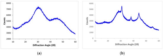 Representative XRD spectrum collected from ground powder from quenched glass of (a) composition 9 and (b) composition 10.