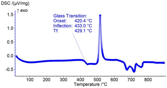 Differential scanning calorimetry was performed using a Pegasus F404 DSC (Netzsch, Selb, Germany), with a silicon carbide furnace in an argon environment. Approximately 25 mg of ground glass was analyzed in a platinum rhodium crucible, fitted with a lid. Glass samples were heated from 50 to 900 °C at a rate of 10 °C/min, with 10 data points collected for each degree (100 data points/min). Thermal curves were assessed to identify the glass transition temperature (as Tonset, Tinflection and Tfinal) and first crystallization temperature using the Netzsch Proteus software.