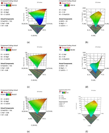 The factors that favoured a decrease in mass loss were NaF > KF > B2O3 × CaO > B2O3 × MgO > CaO × Na2O as visualised in Figure 5a. The mass loss following 12 h was best fitted to a linear model, with the factor favouring increased mass loss ranked from greatest to least impact being Na2O > B2O3 > NaF. The factors that resulted in a decrease in mass loss were CaO > MgO > KF as visualised in Figure 5c. The mass loss at 24 h was best modeled using a reduced quadratic model, factors that had a positive impact on, ranked from greatest to least impact were B2O3 > Na2O > NaF > KF, and the factors that favoured a decrease in mass loss, ranked from greatest to least impact were CaO > MgO as visualised in Figure 5e.