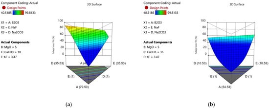 The removal of outliers did not result in an improvement in the model’s predictive ability; however, the adequate precision result of 20.10 suggests that the model is useful in providing an estimate of the crystallinity of materials in this composition space. The factors that had a positive effect on crystallinity (favoured crystallization) in ranking of degree of impact were MgO > B2O3 > CaO > KF, factors that had a negative effect on crystallinity (favoured amorphous glass formation) in ranking of degree of impact were Na2O > NaF > B2O3 × MgO > MgO × KF > MgO × CaO > MgO × NaF > MgO × Na2O, as represented in the 3D surface plot of Figure 2a.