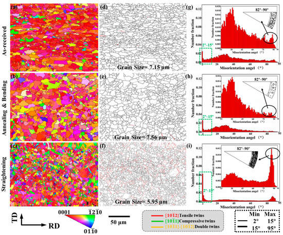 In addition, it can be observed from the misorientation distribution (Figure 2g–i) that the content of low-angle grain boundaries (LAGBs) with misorientation angles in the range of 2°~15° increases after straightening. At the same time, from the distribution of the misorientation rotation axes in the range of 82°~90°, it can be observed that the tensile twins are densely distributed after bending straightening.