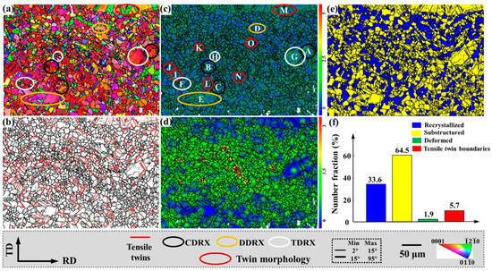 In addition, the twin boundaries around some twins are serrated, which is also characteristic of twinning-assisted dynamic recrystallization (TDRX) [34,35], as indicated by the white circles.