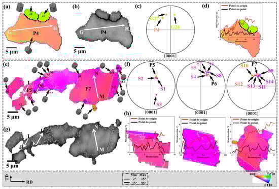Furthermore, as shown in Figure 6e,g, the parent grains P5, P6, and P7 were transformed into subgrains (labeled as S1–S11), forming bulges separated by LAGB. These subgrains are expected to develop into new DRX grains [30]. The {0001} pole figure in Figure 6f shows that almost all of these subgrains (S1–S11) are distributed around the parent grains (P5–P7), indicating that they have similar grain orientations. Figure 6h shows the point-to-point and point-to-origin grain misorientation angles on the white line within the parent grains (P5–P7). The maximum misorientation angle of the point to the origin does not exceed 4.1°, indicating that the distortion inside the parent grain is relatively small.