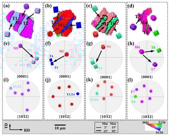 Tensile twin variants of the same parent grain exist in an approximately “parallel” relationship. The grains in the regions I, J, K, and L in Figure 4c are enlarged in Figure 7, and the corresponding IPF, {0001} pole figures and pole figures are also shown in Figure 7.