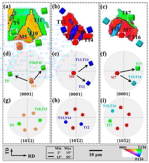 Tensile twin variants with “non-parallel” relationships also exist in the same parent grain, as shown in Figure 8, which corresponds to the grains in the regions M, N, and O in Figure 4c. In Figure 8a, since T10 and T11 are approximately parallel and have the same grain orientation, the {0001} and pole figures indicate that they are the same variant. However, although T9 and T10, T11 have the same grain orientation, they are approximately 45°, and the {0001} and pole figures indicate that they are para-position variants. Similarly, in Figure 8b, since T13 and T14 are the same variants, T12, and T13, T14 have the same orientation but are approximately 120°. The {0001} and pole figures show that they are spacer position variants. In Figure 8c, T15 and T16 are the same variants, which are approximately perpendicular to T17 but have different grain orientations. The {0001} and pole figures indicate that they are neighbor variants.
