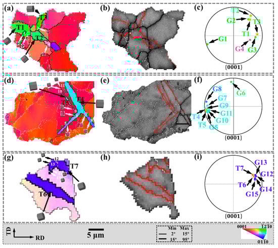 As shown in Figure 9c,f,i, some fine DRX grains (G1–G3, G5, G7, G9–G15) were observed in the twins (T1, T3–T5, T7) and almost all of these fine DRX grains are distributed around the twins (T1, T3–T5, T7) in the {0001} pole figure, indicating that they have similar grain orientations. In addition, DRX grains (G4, G6, G8) with other grain orientations are observed in some twins (T2, T4), and their distribution in the {0001} pole figure is quite different from that of the twins.