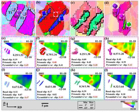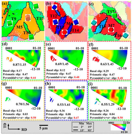 In Figure 10i,j,l, and Figure 11g, the IGMAs of all twins are around the <0001> axis, indicating that the prismatic <a> slip is activated in the tensile twins. In Figure 10k and Figure 11h,i, the IGMA distribution of the twins is relatively uniform, indicating that multiple slip systems are activated in the T5, T6, T16–T21 twins. Among them, the Schmid factor of the pyramidal II<a+c> slip is the highest value, and it is easier to activate during deformation.