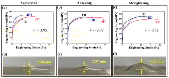 Mechanical behavior: (a,d) as-received sample, (b,e) the sample after annealing, and (c,f) the sample after bending and straightening.