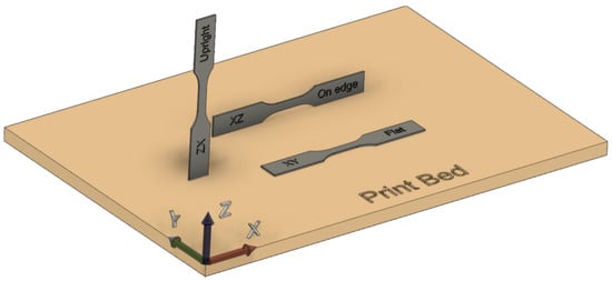 It is important to recall an essential element to understand the test strength properties of 3D printed specimens, that printed materials are anisotropic due to variation of build orientations and used printing strategies [14,15]. Therefore, predefined build orientations are typically used during printing, as shown in Figure 1, to compare different strength test data. The presented orientation nomenclature is applied in the whole text of the article.