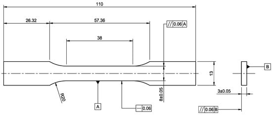Tensile testing followed the standard [19] using the tensile machine MTS 20/M with a load cell of 100 kN. A constant elongation speed of 10 mm/min and a data sampling frequency of 227 Hz were employed during all tests. The tests were conducted at an ambient temperature of 23 °C. The flat dog bone specimens have an overall length of 110 mm, 38 mm gauge length, and 3 mm thickness, as shown in Figure 2.