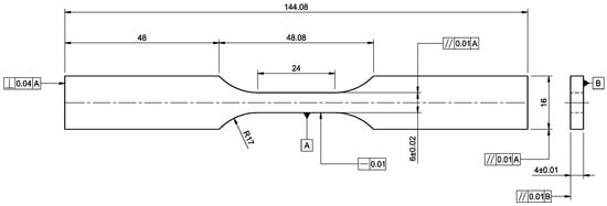 Axial fatigue tests were performed following the standard [20], which involves metallic materials fatigue testing axial force-controlled method with a stress ratio R = 0.1 and a constant test frequency of 30 Hz. The tests were performed using an Instron 8872 universal testing machine with a load cell of 25 kN. The tests were conducted at an ambient temperature of 23 °C. The specimens have a nominal gauge width of 6 mm, a thickness of 4 mm, a gauge length of 24 mm and a nominal length of 144 mm, as shown in Figure 3.